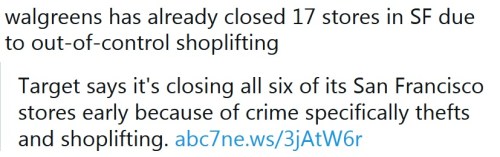 CALIFORNIA: As soon as San Franfeces decriminalized shoplifting, people began to … you know … shoplift. Now … shocker! … stores are closing. It was such an obvious if:then equation, I am forced to conclude that the super rich elites running the city planned it.
