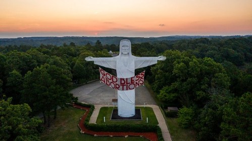 BLASPHEMY: Pro-abortion activists hung a 44-foot banner reading “God Bless Abortions” on a 65-foot tall statue of Jesus called “Christ of the Ozarks” in northwestern Arkansas. The abortion activists disguised themselves as a construction crew to sneak into the property, and then used pulleys and climbing gear to hang the banner.