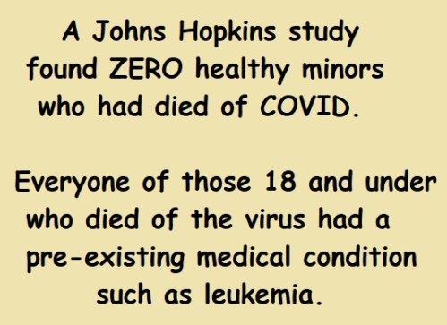 A study out of Johns Hopkins found ZERO corona virus mortality rate among healthy children. ALL of the kids who died of the virus were suffering from a preexisting medical condition such as leukemia. IOW, there is literally ZERO justification for masking and/or vaccinating minors!