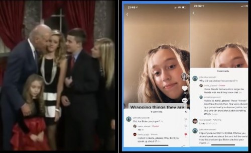 CREEPY VEE PEE: Above left is one of the many images of then-Vice President Joe Biden fondling young girls right in front of television cameras. This one occurred on January 3, 2015, when Biden was swearing in Senator Steve Daines. The little girl, Daines’ niece, was eight years old at the time. Above right is a recent screenshot of a TikTok exchange with the girl, Maria Piacesi, during which she confirms that Joe Biden pinched her nipple.
