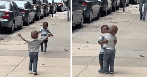 RAAACISM: This really gives the lie to CRT’s claim that kids are innately racist. CLICK https://www.facebook.com/MaBabyLovePMH/videos/538776250507764 [1:32]. The graphic is a still from another adorable video showing two bffs running to meet each other with a huge hug.