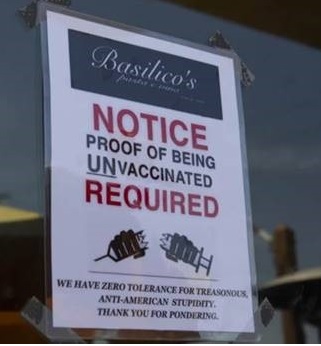 CALIFORNIA: Basilico’s Pasta in Huntington Beach has posted this somewhat tongue-in-cheek sign. (It’s impossible to prove a negative.) The owners are also anti-mask. I’m guessing the clientele will self-sort. LOL