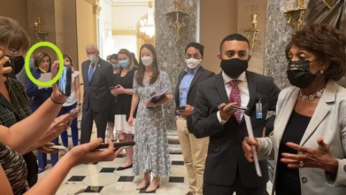 PELOSI: On July 28, Speaker Pelosi stood at the House’s podium to announce the new mask mandate. She had no mask on and she was wiping her nose with a what looks like a Kleenex while also touching the area around her.
