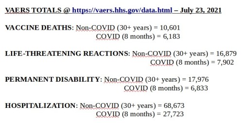 I went to the VAERS website and attempted to reproduce the results on the bar graph. Despite the fact that the site says the end dates are still July 23, I got different numbers. However, the point the graph is making remains the same – i.e., the experimental COVID vaccines are far more dangerous than any FDA approved vaccine. Here are my results.