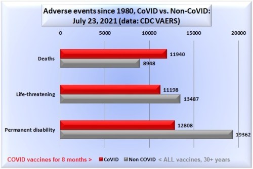 - COVID vaccines for 8 months: The red bar represents all the VAERS reports for the COVID-19 vaccines that got emergency approval for use in the USA from mid-December 2021 through July 23, 2021.