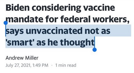 I base this dark assessment on Biden & Co inflaming the passions of their Leftist supporters. The unvaccinated are the problem, Biden will say. They are bad, selfish, dumb. Worse than the virus itself, no doubt. Leftist followers are listening. Closely.