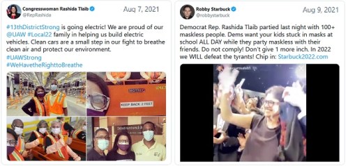 TLAIB: On Sunday, Democratic Michigan Rep. Rashida Tlaib partied in a large crowd of people at a wedding reception in Dearborn, Michigan. But it’s okay. I’m sure it was a sophisticated Democrat crowd, not a superspreader Republican crowd.