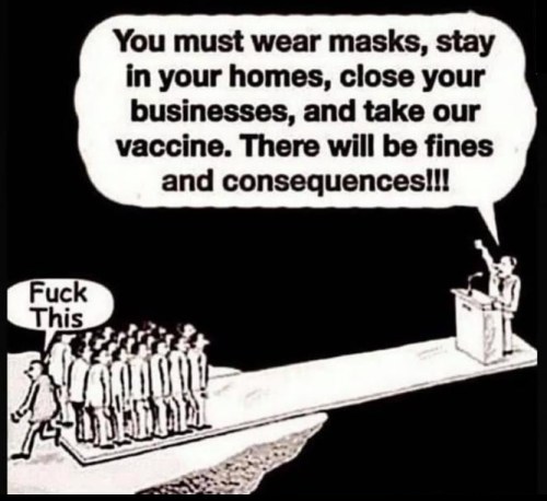 RESIST: I saw this on FB – “Walking into a restaurant. Hello. Table for two, please. Sure. Do you and your guest have your vaccination cards? Can you tell us who our server will be? It looks like Brad. Great, can you show us Brad’s vaccination card? Also, we’d like to see proof that he is not carrying HIV, Hepatitis A or B, or any other communicable disease. And we’d prefer not to be served by someone who is on or uses recreational drugs, so could you provide us with Brad’s most recent tox screen? Um, let me get the manager. That would be great. Thanks.”