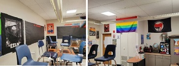 “I have 180 days to turn them [students] into revolutionaries…Scare the f*ck out of them,” he says on the undercover video. “I’m probably as far left as you can go.” The photos above are from his classroom.