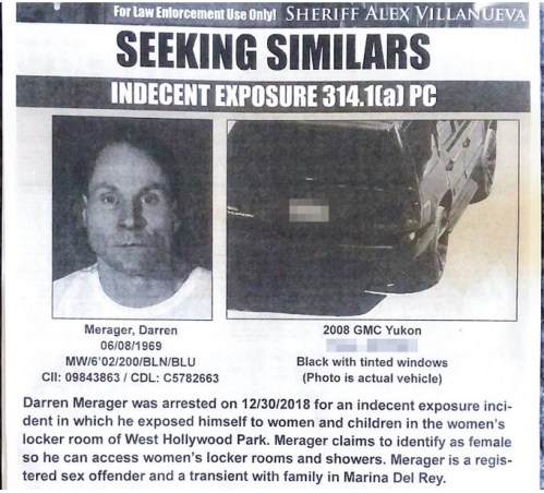 It turns out that the owner of the offending man parts is a tier-one registered sex offender with nearly a dozen felony convictions, including two for indecent exposure. This bottom feeder claims he’s the victim of transphobic prejudice. Police say he has used the trans gag before to flash and gawp at nekkid ladies.