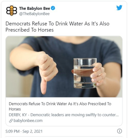 - The Babylon Bee was forced to clarify its Ivermectin joke on Dems refusing ‘to drink water as it’s also prescribed to horses’ – twitchy.com