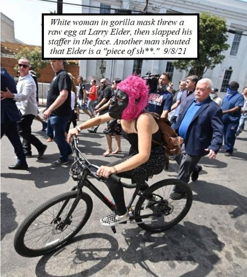 RACISM: On Sept 8, a white woman in a gorilla mask hurled a raw egg at Larry Elder while he was touring a homeless encampment. When one of his staffers confronted her, she slapped him.