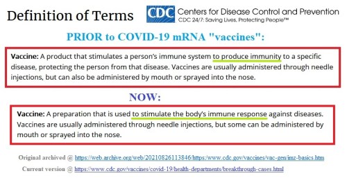 BIG PHARMA’S WHORE: After the introduction of COVID mRNA gene therapies. the CDC quietly changed its definition of “vaccine” in an apparent attempt to validate calling these substances “vaccines.” Note the subtle, but important differences. Vaccines have always been intended to stop infection, but the COVID gene therapies can’t and don’t do that. They are designed only to lessen the degree of infection.