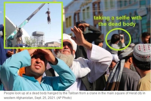 TALIBAN: Since the Taliban overran Kabul on Aug. 15 and seized control of the country, the world has been watching to see whether they will re-create their harsh rule of the late 1990s. Methinks the question isn’t if they will do it, but how fast they will get it done. The latest blast from the past … hanging dead bodies up for public display to demonstrate what happens to people who defy them.