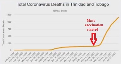 “The spike protein is pathogenic and it will damage you. … The vaccinated are defenseless against variants. This is no longer a pandemic of COVID-SARS-2. This is a pandemic of variants. … If a super-variant is created, nothing can stop it. … Mass vaccination [is not about] following the science. It’s about following the money. … From March 2020 and April 6, 2021, 145 people died of COVID-19 on Trinidad and Tobago. On April 6, 2021, they instituted public mass vaccination. … Over the next four months, 1,022 people died. … The vaccinations caused a death spike.” [CtH: Some of my “quotations” are paraphrased to get to the meat of his comments.]