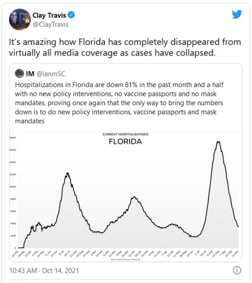 FLORIDA: Last summer, when Florida was suffering a ‘rona spike, the media crowed. Now that Florida has just reached the 3rd lowest rate of infection in the country, the media doesn’t care.
