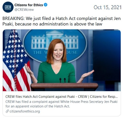 HATCH ACT: During a press briefing, WH spox Jenn Psaki said, “We’re going to do everything we can to help former Governor McAuliffe, and we believe in the agenda he’s representing.” That appears to be an endorsement of his candidacy.