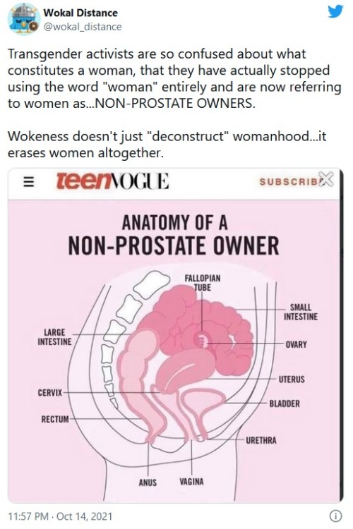 TRANS: “In addition to relinquishing the ‘women’s rights’ argument for abortion, because the word ‘woman‘ is disallowed in the context of pregnancy, abortion-rights advocates can no longer use the ‘imagine if men could get pregnant!’ line because now apparently men do get pregnant.” – Alexandra DeSanctis Marr