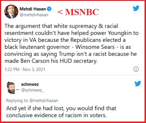 Also, Dems would like the Republican win to be about Trump. But Trump himself stayed out of it and Youngkin didn’t talk about him, sticking instead to specific issues facing everyday Virginians. And he won a huge victory against the establishment Democrat who was considered a shoe-in.