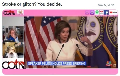 PELOSI: CLICK https://twitter.com/Ablonde20211/status/1456631801271574534 [1:50] to hear San Fran Nan say … ummm … I dunno what. It’s kinda sad that these people have no lives apart from the power they hold in their offices. How many have hung on and on and on, long past when they should’ve gone home? Byrd, who came to Congress apparently to sleep in his chair. Kennedy and McCain who both kept on despite having brain cancer. Now Pelosi and Biden. ::smh::