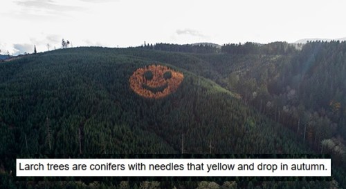 HAPPY AUTUMN: Every fall a hillside along Oregon’s highway 18 greets passersby with a giant smiley face formed by trees. The trees were planted by Hampton Lumber in 2011.