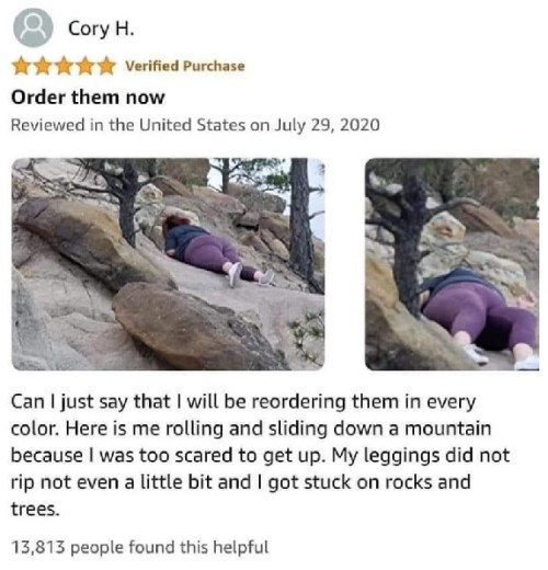 MOUNTAIN SLIDING LEGGING LADY: Totally awesome customer review. LOL