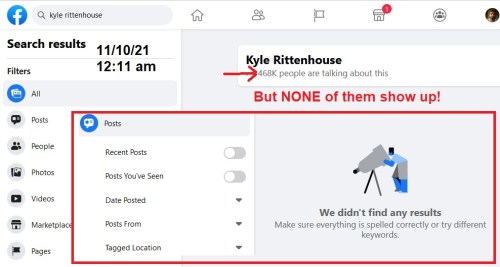 EFFING BEE: The Kyle Rittenhouse case is going so poorly for the mainstream media narrative that Facebook is blocking searches. Above are my results from “kyle rittenhouse.” Changing it to “rittenhouse kyle” did produce results … for now. FYI: A similar search for “george floyd” produced numerous results, so it’s not about the order of the name.