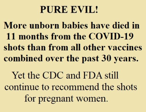 VAXXX: According to VAERS, there have been 2,433 fetal deaths among pregnant women who have been injected with one of the COVID-19 shots. Most were from the Pfizer (1,862 deaths) and Moderna (656 deaths) shots. Compare this to the VAERS result of 2,183 for fetal deaths among pregnant women following all other vaccinations over the past thirty years.