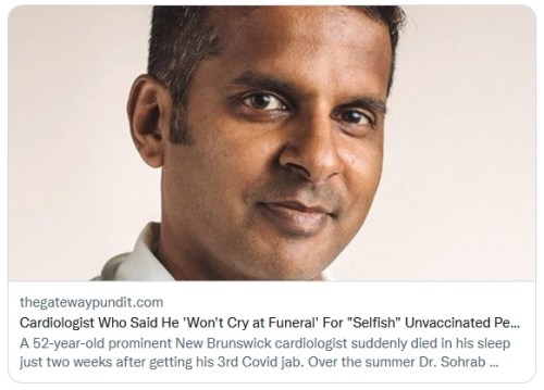 COVID-19: A prominent New Brunswick cardiologist suddenly died in his sleep just two weeks after getting his 3rd Covid jab. Last summer, he tweeted, “For those that won’t get the shot for selfish reasons – whatever – I won’t cry at their funeral.”