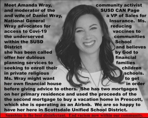 ARIZONA: The Scottsdale Unified School District is hiring a forensic investigator to determine if school resources were used to create a private dossier on parents who have been openly critical of the school board president. The alleged dossier reportedly includes the graphic shown, as well as a photo of a parent superimposed over a lynching, as well as both public and surveillance data.