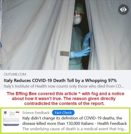 EFFING BEE: The article says, “Italy’s Institute of Health now counts only those who died from COVID-19 has having died from COVID-19, reducing COVID-19 deaths in the hard-hit country from over 130,000 to fewer than 4,000.” The other 97% of Italians in that 130,000 died of other causes while simultaneously infected with COVID-19.
