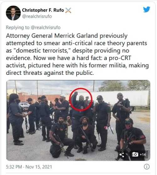 CRT: In Fort Worth, a pro-critical race theory activist named Malikk Austin shouted at a group of anti-CRT parents, saying that he has “over 1,000 soldiers ready to go” and that they will come “locked and loaded” to the next meeting. Austin is a former member of the The Brotherhood black militia group.