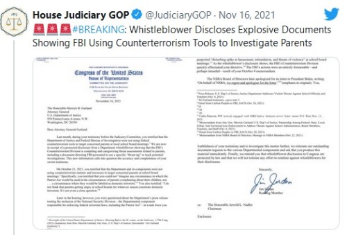 AG GARLAND: On Tuesday, a whistleblower provided documents to the House Judiciary Committee alleging the FBI is using counterterrorism tools to investigate American parents.