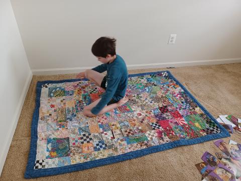 GRAMMY NOTES: The Mascots are packed and about to begin another cross country move to a new duty station. They’re swinging by here for a day or two and I can’t wait to see how tall Buzz is. His legs look so long in this picture! I made that floor play pad when he was a baby. It’s thicker than a bed quilt and has extra thick borders to keep toys (and wee babies) from rolling off.