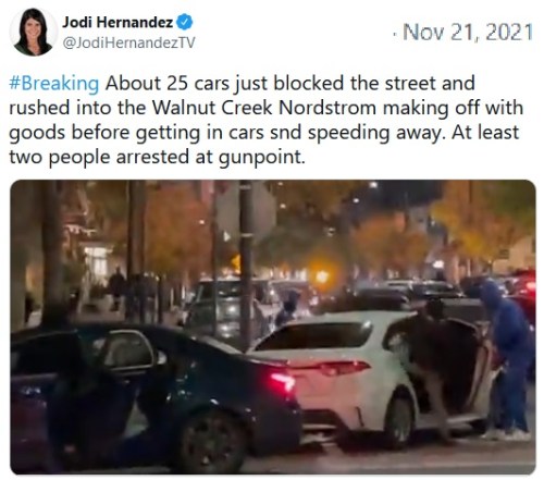 SAN FRANCISCO: Gang looting is trashing affluent stores in the San Francisco Bay Area. The gangs travel in large groups of vehicles, block roads, take whatever they can, before speeding away, all while wearing black bloc to prevent security cameras from identifying them. In recent days, they’ve hit up a Louis Vuitton store and a Nordstrom store.