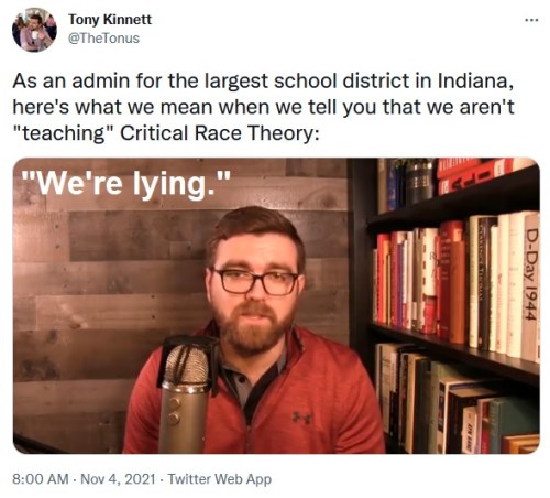 CRT: CLICK https://twitter.com/TheTonus/status/1456229919986528258 [1:36] – After making this video, Tony Kinnett was placed on leave and was banned from entering school buildings. He has now been fired … basically for sharing publicly available information the school district didn’t want out there.