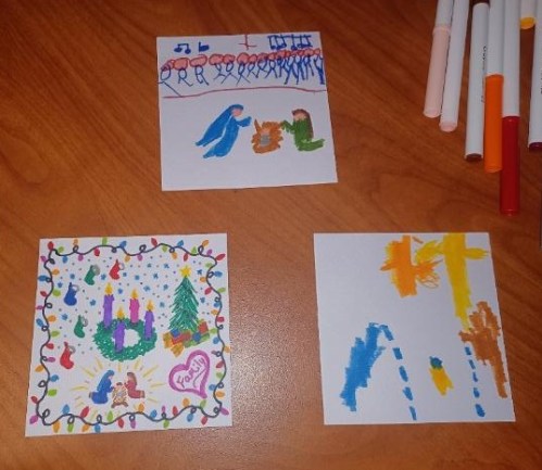 GRAMMY NOTES: Mama Buzz is planning to have the kids do an art project for each of the 12 days of Christmas. The first was, “Depict what the beginning of the holiday season looks like for you.” Bunny’s is the church Nativity and choir singing. Bootz says of his, “Mary and Joseph are sad, because they are cold and hungry. The yellow is the Christmas star. The orange is the evil star.” Further questioning uncovered that the “evil star” is Herod. The lower left is obviously by Mama. Apparently, Buzz wasn’t interested in art.