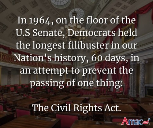 FILIBUSTER: The Effing Bee is sticking a “fact check” on this graphic. Cuz, it was only SOUTHERN Democrats who held up the Civil Rights Act for 60 days!