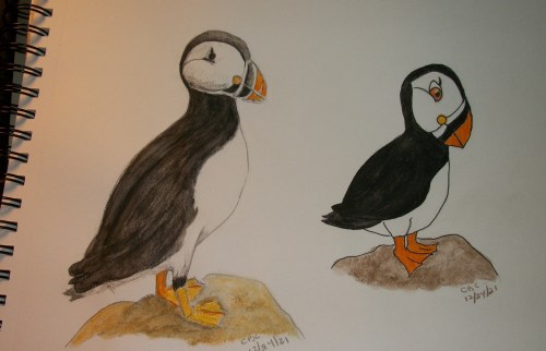 GRAMMY NOTES: One of my SkillShare classes taught about drawing a subject, then analyzing what is characteristic about it so it can be simplified into a cute cartoon that is still recognizable as that subject. Making something cute generally involves making it more baby/toddler like –i.e. bigger head, bigger eyes, rounder shapes. I applied these ideas and am really happy with both of my puffins.