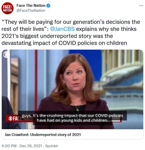 KIDS: A recent study has found that lockdowns, masks, and fear have significantly impacted the intellectual, social, and psychological development and health of our kids. CLICK https://twitter.com/FaceTheNation/status/1475209878415323140 [1:40] to hear a report.