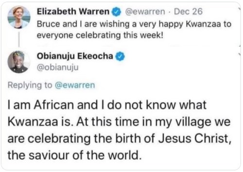 KWANZAA: “’Kwanzaa’, celebrated exclusively by white liberals, is a fake holiday invented in 1966 by [a] violent nationalist rival to the Black Panthers. … It’s as if David Duke invented a holiday called