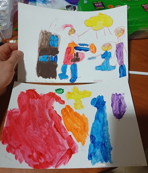 GRAMMY NOTES: Today’s art challenge was “Paint a picture of Santa.” The top one by Bunny is “St. Nicholas feeds the hungry.” The bottom one by Bootz isn’t titled. I’d like to think it’s Santa honoring the Baby Jesus in the manger with Mary and Joseph standing by, which is what Mama tells me she’s working on. But the orange blob that I thought was Jesus is labeled “Santa’s bag.” So I don’t know! LOL