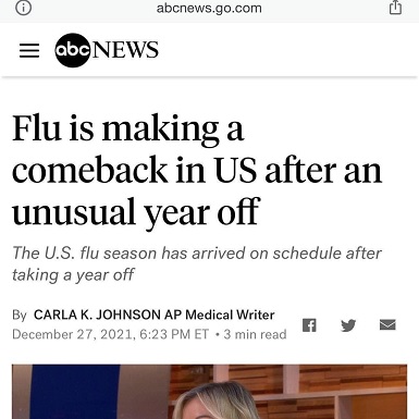 FLU: N.b., This has NOTHING WHATSOEVER to do with the fact that the too-sensitive COVID tests don’t distinguish between the flu and the ‘rona. So shut up.