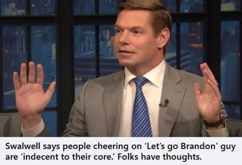 LGB: I think the man who called Biden on Christmas and said, “Let’s go, Brandon” to him is the kind of guy who does rude stuff because he thinks he’s a laugh-riot prankster. I dislike bad manners and I hate pranks. But whatever. It’s the Left’s outrage that is the story today. After 5 years of spewing spittle and vicious insults over their Donald “LITERALLY HITLER” Trump, none of these people has any moral authority to complain about what LGB guy said to FAUXTUS… least of all “Fang Banger” Eric Swalwell!