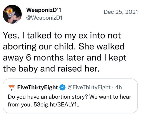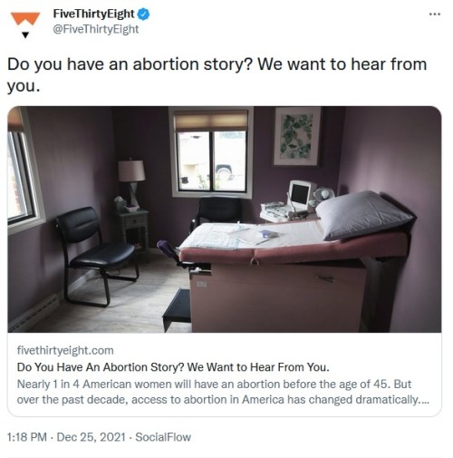 FiveThirtyEight thought it would be a great idea to solicit abortion stories on Christmas. It didn’t go quite as they hoped. A few of the replies were of the “hurray, I don’t have to pay child support” or “screw you, I’m glad I aborted” genre. But most were like the sampling below.