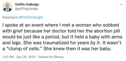 “I know three women that have had abortions. All three were talked into it by someone else. All three say it’s the biggest regret they have in their lives.”