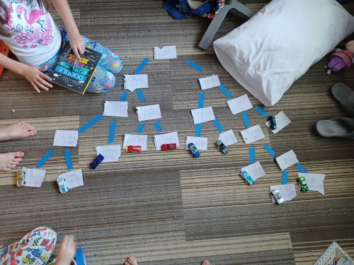 HOME SCHOOL UPDATE: Mama had them use their Hot Wheels cars to make a tree diagram. I remember a home schooling mom say, “People think I have a room with little desks in a row, but really, we sit around in our jammies and ask each other questions.”