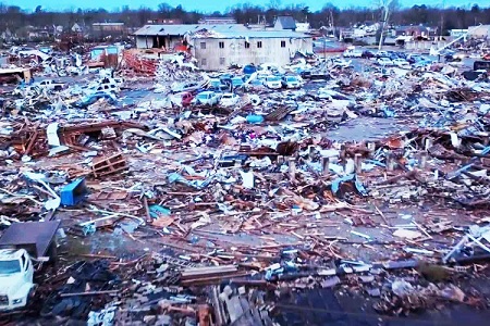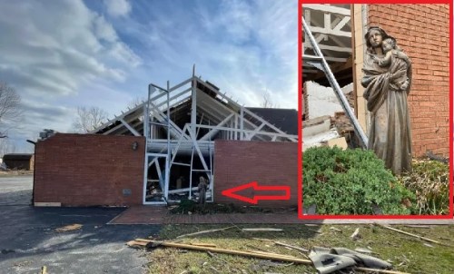 TORNADOES: The windows and doors of Resurrection Catholic Church in Dawson Springs, KY, were blown out and the roof is missing. The building will probably be ruled a total loss. The statue of Mary and the Christ Child standing mere inches from the caved-in entry is totally unharmed.