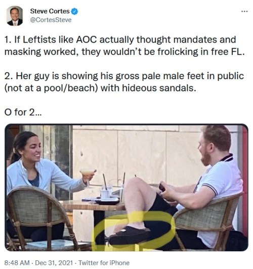 AOC: AOC responded to criticism of her decision to vacation in DeathSantis’ Super Dangerous State by dunking on Gov. Ron for going “missing” for the past two weeks. It turns out he’s been with his wife, who is undergoing cancer treatment. Classy, Sandy. Real classy.