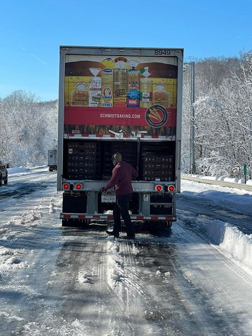 I-95: For 24 hours this week, 48 miles of traffic was stopped by freezing temperatures. One couple noticed that a Schmidt Baking truck was also stuck out on the road with them. They called the company and asked them to open up the truck to stranded motorists who had been there all night, most without food or water, some with elderly passengers, small children, and pets. The company owner called the driver and told him to open up. With the help of some people close by, they were able to give bread to more than 50 cars.